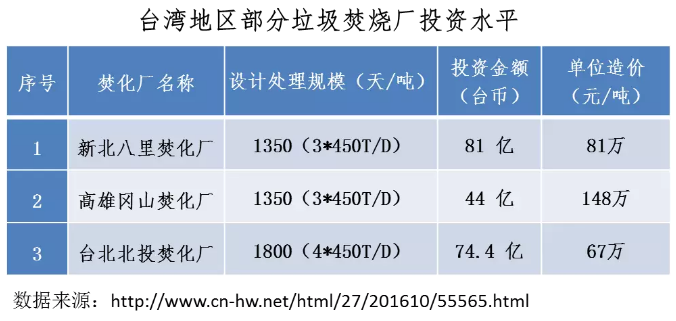 相較于目前大陸地區(qū)采用爐排爐工藝的垃圾焚燒電廠的噸投資成本(穩(wěn)定在40-52萬(wàn)元)1,臺(tái)灣地區(qū)垃圾焚燒廠的單位造價(jià)成本遠(yuǎn)高于大陸地區(qū)平均投資水平。
