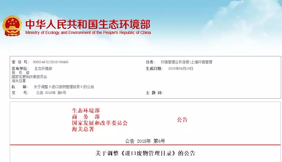 關(guān)于調(diào)整《進口廢物管理目錄》的公告