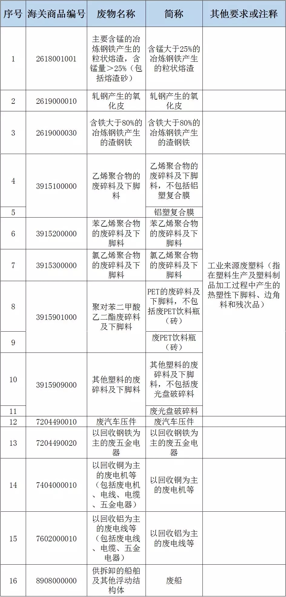 一、將廢五金類、廢船、廢汽車壓件、冶煉渣、工業(yè)來源廢塑料等16個品種固體廢物(見附件1),從《限制進口類可用作原料的固體廢物目錄》調(diào)入《禁止進口固體廢物目錄》,自2018年12月31日起執(zhí)行。