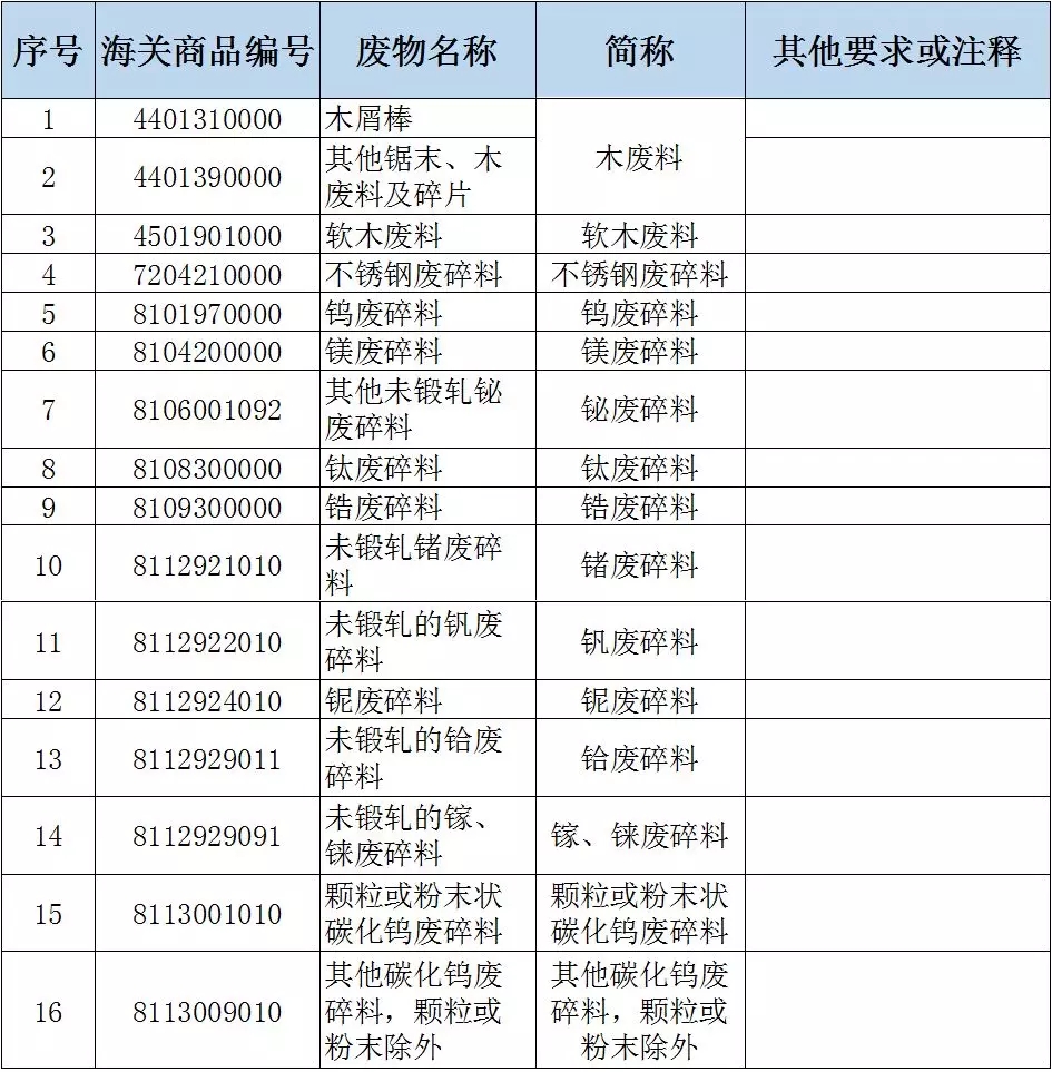 二、將不銹鋼廢碎料、鈦廢碎料、木廢碎料等16個品種固體廢物(見附件2),從《限制進口類可用作原料的固體廢物目錄》《非限制進口類可用作原料的固體廢物目錄》調(diào)入《禁止進口固體廢物目錄》,自2019年12月31日起執(zhí)行。