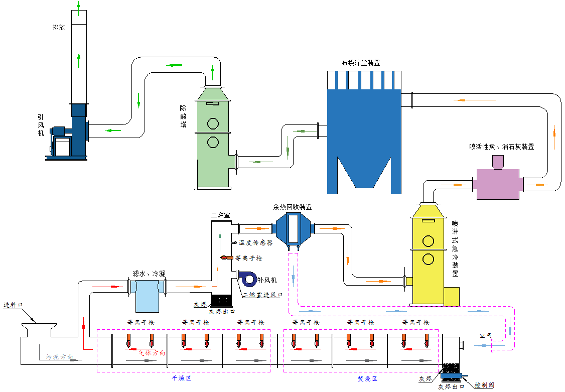 等離子火炬污泥焚燒裝置由等離子火炬、等離子火炬電源、進出料裝置、隧道窯(由多個窯爐單元組合而成)、攪拌輸送、尾氣處理系統(tǒng)組合而成。(如圖所示)