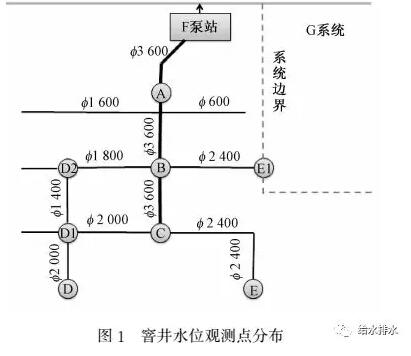 試驗開始前,對F調(diào)蓄池實施徹底清淤。每次試驗時,一般每隔24 h開啟調(diào)蓄池,調(diào)蓄池蓄滿時間均在15 min左右。設(shè)計試驗時,在F泵站進水總管、F系統(tǒng)邊界處,設(shè)置8個窨井水位觀測點,分別為:位于總管上的A、B、C 3個點;和B點直接相通的D2點、和B點直接相通且位于系統(tǒng)邊界處的E1點;相對位于遠(yuǎn)端的、類似于進水管“肩膀”處的D、E、D1等3個點,詳見圖1。