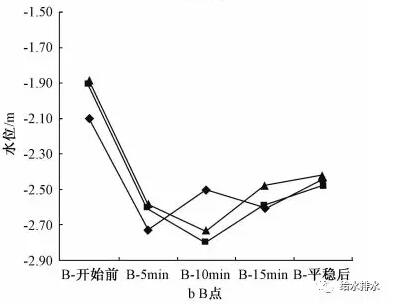 試驗發(fā)現(xiàn),A、B、C、D2、E1等5個點的水位,會隨F調(diào)蓄池進水至蓄滿而呈U型狀變化,以A、B、C為例(見圖2),基本都在10~15 min時水位變化最為明顯。但位于遠(yuǎn)端的D、E、D1等3個點幾乎未發(fā)生變化。由此可以初步判斷,F(xiàn)調(diào)蓄池對進水總管的拉動,至C點結(jié)束,總長約1 200 m;調(diào)蓄池的運行,僅對鄰近的管網(wǎng)起到了收水效果。