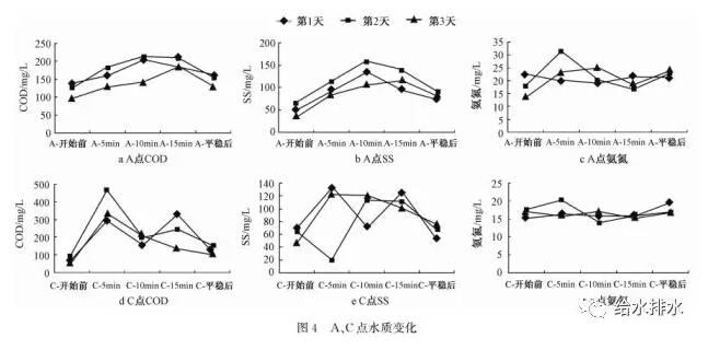 更值得注意的是A、B、C、D2、E1這5個點的水質(zhì)變化,以A、C兩點為例(見圖4),在15 min的進水過程中,隨著水位突降,COD和SS呈現(xiàn)出一個突增趨勢,氨氮卻相對平穩(wěn)。同時,調(diào)蓄池內(nèi)的水質(zhì)也大致如此,COD和SS在最后一天時達(dá)到最大值,而氨氮卻總體穩(wěn)定。