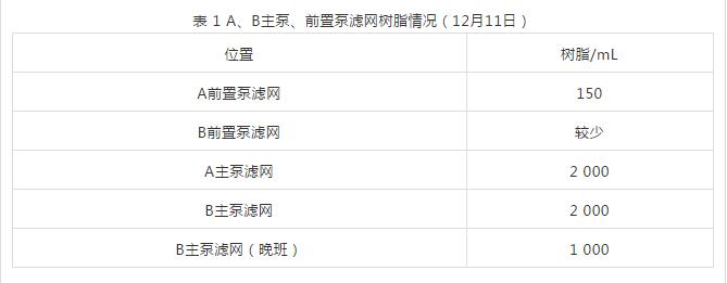故障三:凝結(jié)水中有樹脂,過熱蒸汽電導率超標,給水泵主泵、前置泵濾網(wǎng)壓差大,檢查有樹脂。12月11日5:00檢修處理給水泵密封水進水濾網(wǎng)時發(fā)現(xiàn)網(wǎng)面內(nèi)有樹脂,樹脂顆粒完整,顆粒偏小。同時,化學儀表取到水樣后發(fā)現(xiàn)過熱蒸汽電導率高達1.4 μS/cm(剛升爐時,人工分析蒸汽二氧化硅合格),并在7:30最大至1.8 μS/cm。檢查發(fā)現(xiàn)給水泵主泵、前置泵濾網(wǎng)壓差大,A、B主泵、前置泵濾網(wǎng)樹脂情況見表 1。