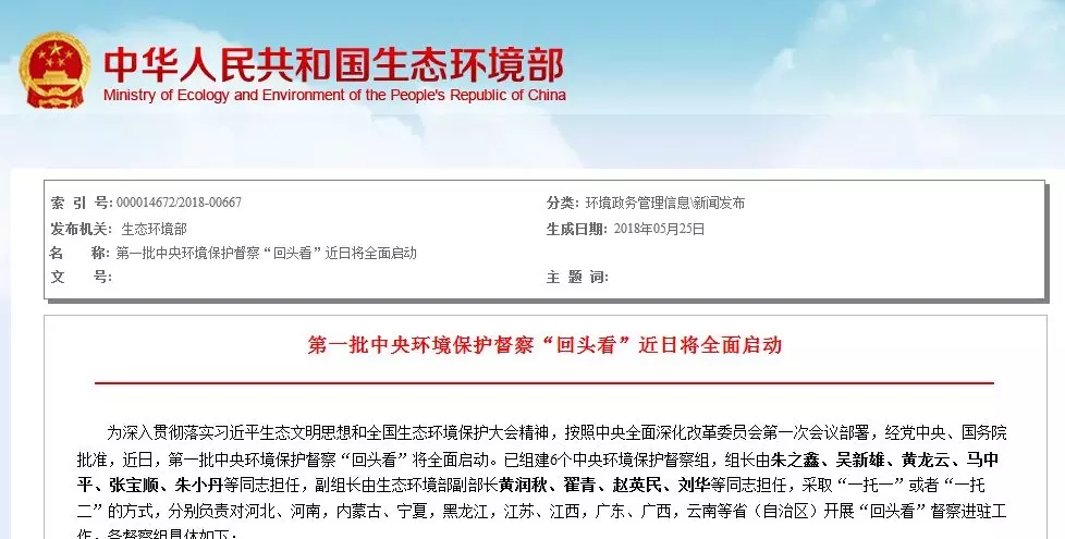近日,第一批中央環(huán)境保護(hù)督察“回頭看”將全面啟動,對河北、河南,內(nèi)蒙古、寧夏,黑龍江,江蘇、江西,廣東、廣西,云南等省(自治區(qū))開展“回頭看”督察進(jìn)駐工作,進(jìn)駐時間約為1個月。