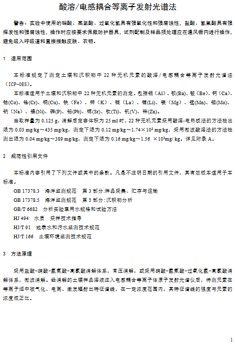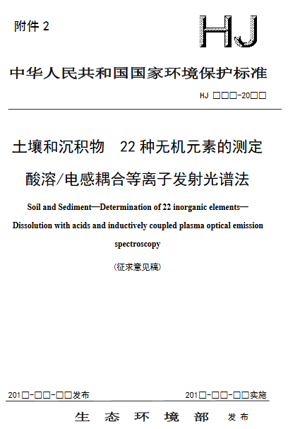 為貫徹《中華人民共和國(guó)環(huán)境保護(hù)法》,保護(hù)與控制土壤環(huán)境質(zhì)量,保障人體健康,規(guī)范土壤沉積物中無(wú)機(jī)元素的測(cè)定方法,生態(tài)環(huán)境部印發(fā)《土壤和沉積物 22種無(wú)機(jī)元素的測(cè)定 酸溶/電感耦合等離子發(fā)射光譜法(征求意見(jiàn)稿)》,詳情如下: