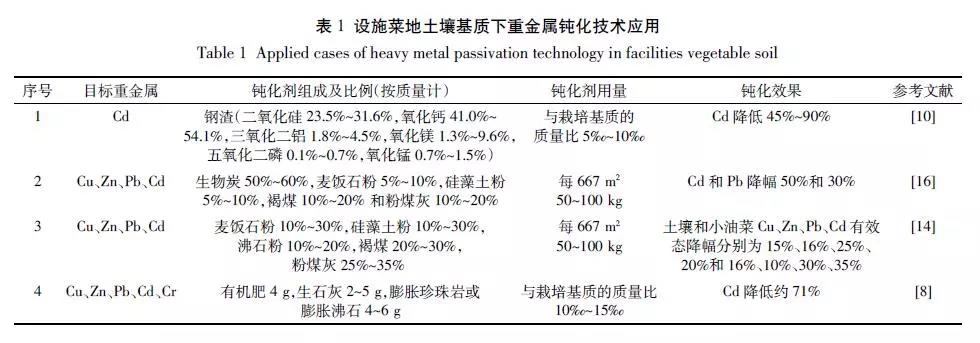 設(shè)施菜地土壤基質(zhì)重金屬的鈍化技術(shù)的研究方法以田間試驗為主,少量采用實驗室內(nèi)試驗的方法。涉及的主要污染物有Pb、Cd、Cr、Cu、Zn 5種。用到的鈍化劑主要有(1)黏土礦物,如麥飯石粉、硅藻土粉等;(2)碳材料,如秸稈炭等;(3)硅鈣材料,如生石灰、珍珠巖等;(4)有機物料,如褐煤等;(5)工業(yè)廢棄物,如粉煤灰、鋼渣。每667 m2土壤中重金屬鈍化劑的用量為50~100 kg。鈍化劑組分中,按質(zhì)量百分比計,生物炭50%~60%、麥飯石粉5%~30%、硅藻土粉5%~30%、褐煤10%~30%、粉煤灰10%~35%、有機肥40%、生石灰20%等。對比不同元素的鈍化效果,土壤中重金屬有效性平均降幅為Cd(29%)>Zn(24%)>Pb(23%)>Cu(22%),差異性不顯著。然而,蔬菜中重金屬有效性平均降幅為Cd(53%)>Pb(31%)>Cu(12%)>Zn(11%)。麥飯石、硅藻土、沸石土等非金屬礦物均具有較強的吸附、離子交換等特性,此類礦物及其改性產(chǎn)物與生態(tài)環(huán)境具有良好的協(xié)調(diào)性,已廣泛應(yīng)用于無機和有機污染的處理。試驗證明,重金屬鈍化劑對土壤和小油菜Cu、Zn、Pb、Cd 有效態(tài)降幅分別是15%、16%、25%、20%及16%、10%、30%、35%,可單獨施入設(shè)施菜田,也可與底肥混拌后施用。生物炭具有多孔性、較大的比表面積、較強的表面吸附能力、高度的化學(xué)惰性,對有機和無機污染物具有高度的親和力,可作為土壤中污染物的鈍化劑。生物炭配施麥飯石、硅藻土、褐煤、粉煤灰為主要原料的鈍化劑,Cd 和Pb降幅可以實現(xiàn)50%和30%。鋼渣作為大量存在的工業(yè)廢棄物,能夠顯著降低植株中的Cd 45%~90%,其效果優(yōu)于粉煤灰、赤泥和石灰(表 1)。