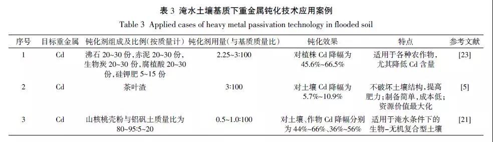 現(xiàn)有的一些鈍化劑具有氧化特性,因此只適用于旱地土壤(耗氧條件),長期淹水條件下有可能因還原變性而喪失固定能力。淹水土壤基質(zhì)重金屬的鈍化技術(shù)研究以田間試驗為主,少量采用實驗室內(nèi)盆栽方法。涉及的主要污染物為Cd。用到的鈍化劑主要有(1)黏土礦物,如沸石等;(2)碳材料,如生物炭等;(3)硅鈣材料,如硅鉀肥、鋁礬土復(fù)合制劑等;(4)有機物料,如腐植酸、茶葉渣及山核桃殼粉等;(5)工業(yè)廢棄物,如赤泥、污泥等。鈍化劑的用量為土壤基質(zhì)質(zhì)量的0.5%~3%,對土壤Cd 的降幅為5.7%~66%,對作物Cd的降幅為36%~66.5%。以湘中某工礦區(qū)稻田淹水土壤受到了嚴(yán)重的重金屬污染為例,污染程度為Cd> Pb > Zn。在淹水3、6、9 個月后,Zn、Cu、Pb、Cd 的殘渣態(tài)基本保持不變,說明短時間的處理對原生相重金屬的影響不大。4 種重金屬形態(tài)均以殘渣態(tài)最低,特別是Cu 和Cd。山核桃殼富含纖維素和半纖維素等生物質(zhì),吸附能力較強,已見利用山核桃殼對水環(huán)境中Cu、Cr、Hg、Cd 等的吸附效果,然而相對于水環(huán)境,吸附土壤重金屬的影響因素更為復(fù)雜。鋁礬土為明礬煉制過程中的副產(chǎn)物,磨碎后具有粒度細(xì)、分散性好、比表面積大等特點。郭彬等首次公開了將山核桃殼和鋁礬土開發(fā)為土壤重金屬鈍化劑的報道,對土壤、作物Cd 降幅分別為44%~66%、36%~56%。楊占彪等首次公開了茶葉渣作為鈍化劑應(yīng)用于土壤Cd 污染,Cd 降幅為5.7%~10.9%。施入茶葉渣不會破壞土壤的結(jié)構(gòu),還可以提高肥力,制備方法簡單,成本幾乎為零(表3)。不同鈍化劑對于不同種類和性質(zhì)的重金屬鈍化效果存在一定差異,因而,在實際應(yīng)用中對重金屬具有一定的選擇性;對于復(fù)合污染土壤來說,單一的鈍化劑很難達(dá)到修復(fù)應(yīng)用的標(biāo)準(zhǔn)。