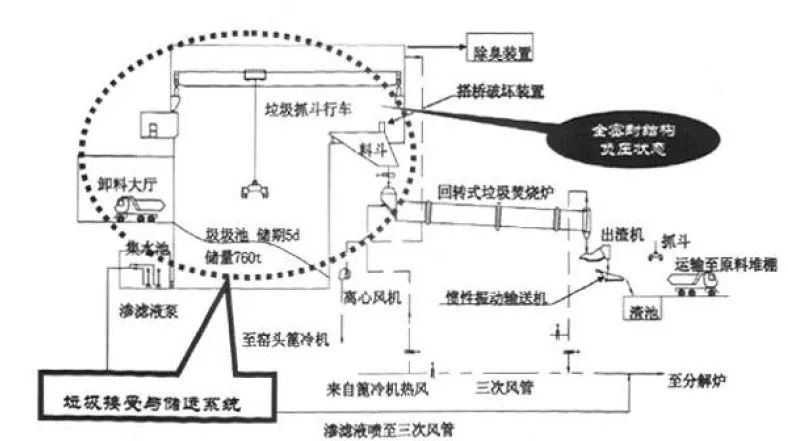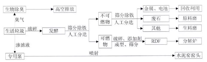圖5 回轉(zhuǎn)式焚燒爐與水泥窯協(xié)同處置生活垃圾工藝流程圖