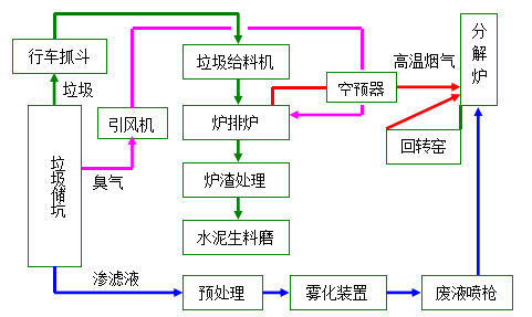 垃圾在儲(chǔ)存過程中生成的滲濾液為高濃度有機(jī)污水,經(jīng)過濾處理后,噴射至分解爐內(nèi)高溫蒸發(fā)氧化處理,完全分解有機(jī)成分,實(shí)現(xiàn)無害化。