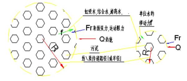 對(duì)于同一質(zhì)量的水分子而言,遷移運(yùn)動(dòng)消耗的動(dòng)能就是其移動(dòng)阻力(f)和路徑(R)的 正函數(shù)值,隨著移動(dòng)路徑(R)的增加而明顯增大,這些動(dòng)能在干燥過程中都是由熱能轉(zhuǎn)變 而來的。因此,在同一物料工況表面張力(Fr)恒定的情況下,路徑(R)越大,附帶(除 水分汽化的)消耗的熱能越高。
