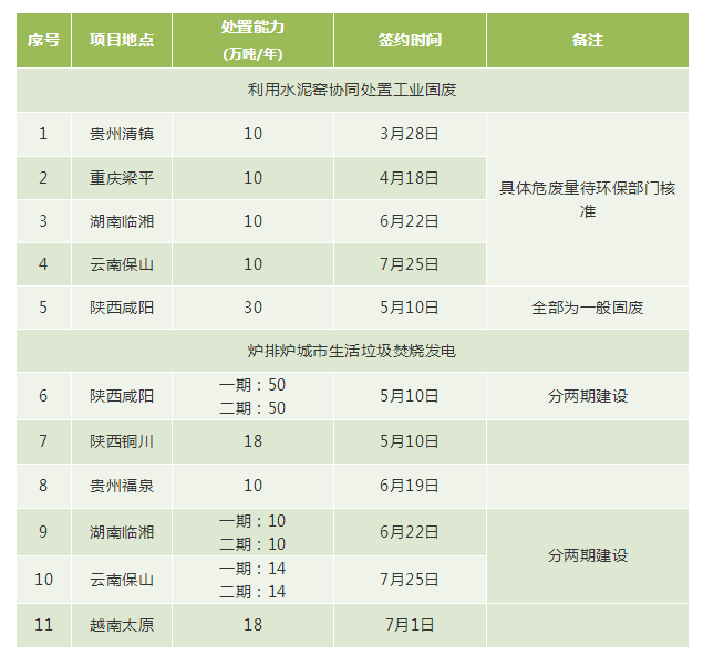 2018年二季度以來,公司新增簽約11個(gè)環(huán)保項(xiàng)目,其中利用水泥窯協(xié)同處置工業(yè)固廢危廢項(xiàng)目5個(gè)、爐排爐垃圾焚燒發(fā)電項(xiàng)目6個(gè),新增處理生活垃圾194萬噸/年、處置固廢危廢70萬噸/年的產(chǎn)能規(guī)模。