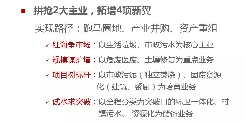 抓住環(huán)保行業(yè)持續(xù)增長(zhǎng)的趨勢(shì)和新興業(yè)務(wù)爆發(fā)式增長(zhǎng)的契機(jī),繼續(xù)以“2+4”業(yè)務(wù)為重點(diǎn),通過實(shí)施主動(dòng)擴(kuò)張戰(zhàn)略,快速提升市場(chǎng)規(guī)模,確保三年發(fā)展成為“3+3”并力爭(zhēng)向“4+2”業(yè)務(wù)格局轉(zhuǎn)型,并探索業(yè)務(wù)的延伸。