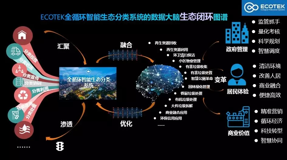與此同時,行業(yè)技術(shù)從簡單的設(shè)備應(yīng)用發(fā)展至如今的互聯(lián)網(wǎng)+深度推廣模式。智慧環(huán)衛(wèi)的服務(wù)主體逐步向大眾傾斜,因此,專注于全循環(huán)智能分類的生態(tài)系統(tǒng)(ECOTEK)應(yīng)運(yùn)而生。