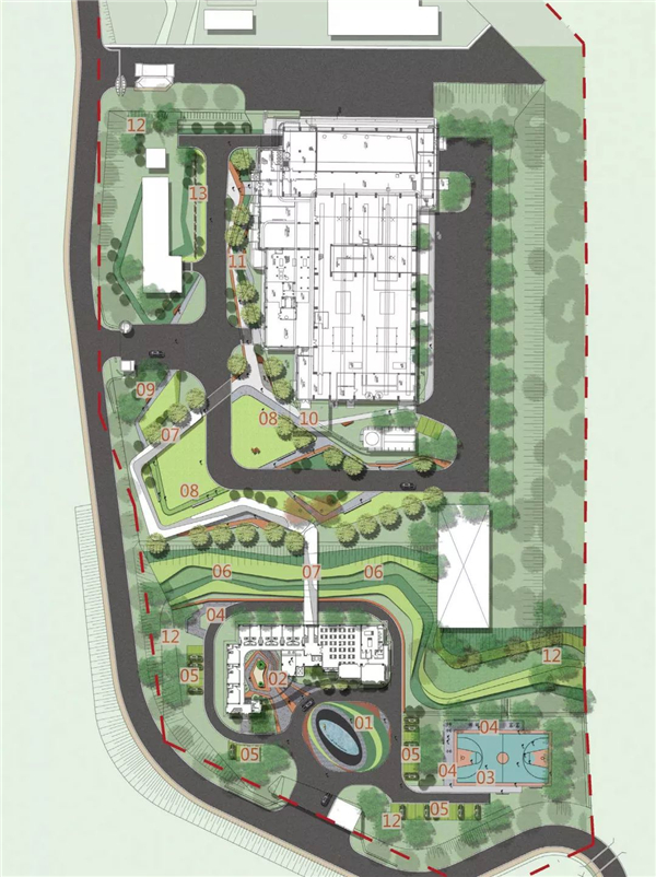 01 入口水景廣場(chǎng);02 接待庭院; 03 運(yùn)動(dòng)廣場(chǎng); 04 休閑節(jié)點(diǎn);05 生態(tài)停車(chē)位; 06 景觀坡地; 07 景觀廊橋; 08 休閑庭院;09 景觀亭;10 觀景平臺(tái); 11參觀步道; 12 組團(tuán)綠化; 13 景觀屏風(fēng)