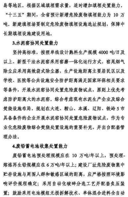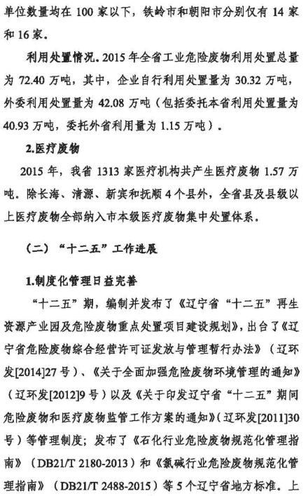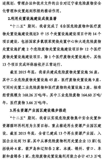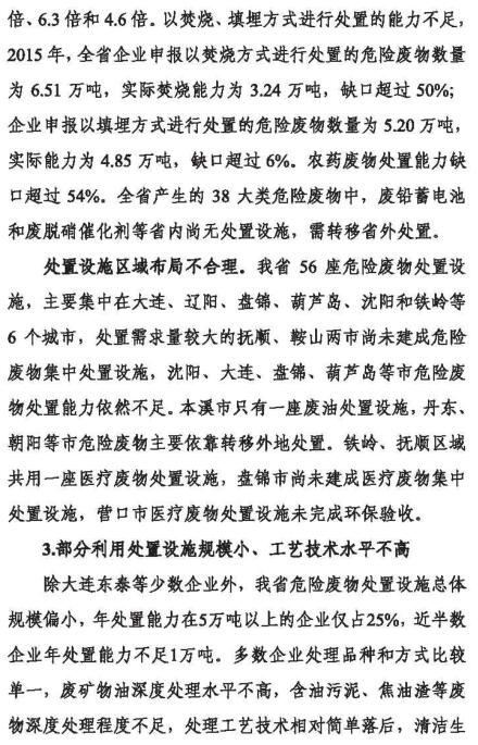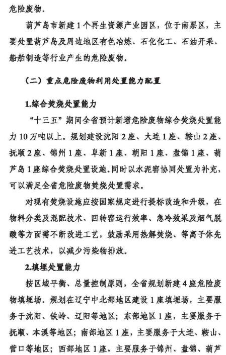 日前,遼寧環(huán)保廳公布了《遼寧省“十三五”危險(xiǎn)廢物污染防治規(guī)劃》,預(yù)計(jì)“十三五”期間危險(xiǎn)廢物利用處置設(shè)施建設(shè)資金投入達(dá)20億元以上,全省新增危險(xiǎn)廢物處置能力50萬(wàn)噸以上,全省危險(xiǎn)廢物利用處置總能力達(dá)220萬(wàn)噸,基本滿足全省危險(xiǎn)廢物利用處置需求。