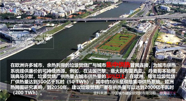 在法國的巴黎,人們在城市中心建立了垃圾焚燒裝置,這些建在城中心的裝置,不僅可以更方便地收集垃圾,還可以更高效地為垃圾焚燒裝置周邊的居民提供可持續(xù)的熱水供應(yīng)。這個(gè)裝置就在塞納河邊,遠(yuǎn)處就是大家都知道的埃菲爾鐵塔。當(dāng)?shù)鼐用裰越邮苓@么一個(gè)裝置,而不是讓這個(gè)裝置遠(yuǎn)離自己的家,因?yàn)樗峁┝藷o害化的處置,高效的能源供應(yīng),以及一個(gè)低成本的利用熱水的選擇。