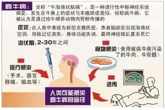 食用被瘋牛病污染了的牛肉、牛脊髓的人,有可能染上致命的克羅伊茨費爾德—雅各布氏癥(簡稱克-雅氏癥),其典型臨床癥狀為出現(xiàn)癡呆或神經(jīng)錯亂,視覺模糊,平衡障礙,肌肉收縮等。病人最終因精神錯亂而死亡。