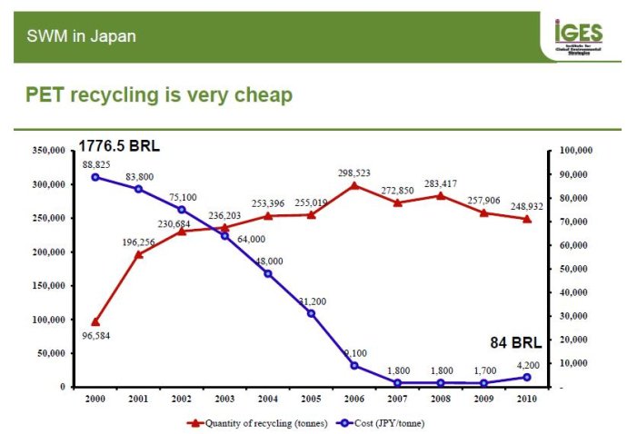 2)國內(nèi)常常傳頌這樣的說法,感嘆日本分類如何細致甚至極致。比如說PET塑料瓶,扔之前需要喝光、去掉瓶蓋,撕掉標(biāo)簽、踩扁瓶子。這樣的行為不僅值得敬仰,當(dāng)然也值得學(xué)習(xí)。但需要思考的是,這樣做的目的是什么,是分類收集,還是為了資源回收利用?日本是比中國資源短缺的國家,日本的石油主要依靠進口。我們想當(dāng)然地會認為日本回收的塑料瓶應(yīng)該作為替代石油原料進行回收利用,可事實日本回收這些廢塑料主要是為了出口,而且主要是出口到中國。從經(jīng)濟角度分析,日本投放PET塑料瓶的行為,這是為了降低廢PET加工成本,出口到中國具有更好的競爭力。日本的一項研究報告顯示,在2000年日本PET塑料瓶的回收成本是800多美元每噸,而到了2008年前后,這一回收成本降到10多美元每噸,這恐怕就是撕掉塑料瓶標(biāo)簽的貢獻。這樣的行為與其說是分類收集、環(huán)保意識,不如說日本的民族意識或集體意識更確切。