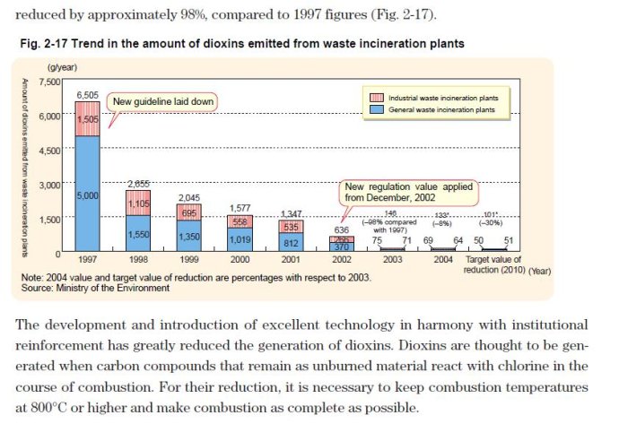 3)國內(nèi)有些人想當(dāng)然的認為,日本垃圾焚燒二惡英排放量大幅度下降是由于生活垃圾分類收集做得好。根據(jù)日本環(huán)境部發(fā)布的建設(shè)循環(huán)型型社會白皮書(technologies to support a sound material-cycle society-development of 3R and waste management technologies 日本環(huán)境部, 2007),日本生活垃圾焚燒廠二惡英年排放量由5000ngTEQ(1997年)下降到71 ngTEQ(2003年)、52 ngTEQ(2007年),分別下降98%、99%。日本環(huán)境部總結(jié)生活垃圾焚燒二惡英大幅度下降的原因:執(zhí)行嚴格的標(biāo)準(zhǔn)、淘汰或關(guān)停不達標(biāo)的生活垃圾焚燒廠、保障生活垃圾在800度以上穩(wěn)定燃燒,煙氣快速冷卻以及煙氣處理。要保障生活垃圾在800度以上穩(wěn)定燃燒,工藝技術(shù)上要實現(xiàn)連續(xù)穩(wěn)定焚燒,就要采用有規(guī)模的爐排爐;要使煙氣快速冷卻到300度以下(也就是避開所謂二惡英再合成的溫度區(qū)間),采用余熱鍋爐即可以實現(xiàn)快速冷卻,這對于有規(guī)模生活垃圾焚燒廠是自然的事。至于煙氣處理包括袋式除塵、酸性氣體洗滌、活性炭吸附、催化脫硝這些技術(shù)工藝是保障生活垃圾焚燒二惡英達標(biāo)排放的重要技術(shù)手段,總之,是技術(shù)手段的進步使日本生活垃圾焚燒二惡英排放大幅度減少。1997年到2007年日本焚燒的生活垃圾無論是成分還是量都沒有明顯變化,所謂生活垃圾分類使二惡英大幅度下降完全是一些國人的臆想。