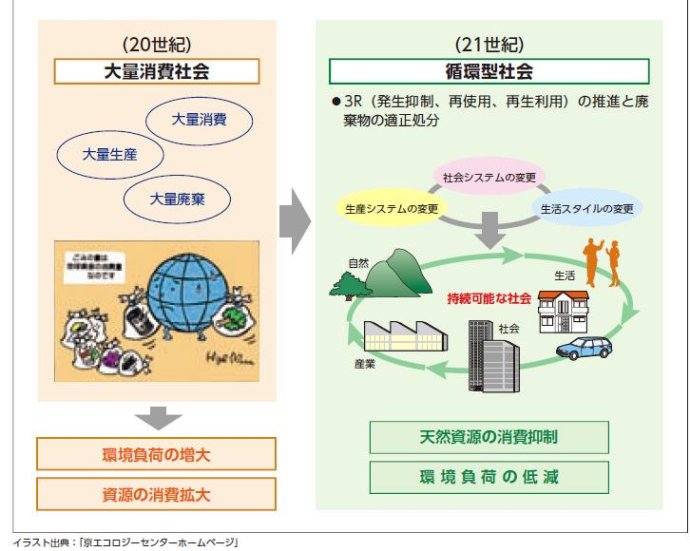 4)日本生活垃圾產(chǎn)生量的下降不是因為垃圾分類,而是改變消費模式。1997年到2007年是日本生活垃圾分類收集全面實施的10年,生活垃圾回收利用率從1997年11%提高到2007年20.3%,但生活垃圾的產(chǎn)生量并沒有明顯下降,1997年到2000年期間還有所增長,2000年達到最高值,2000年后開始有所下降,由人均生活垃圾日產(chǎn)生量1.132千克下降到0.90千克(2014年),巧合的是日本建設(shè)循環(huán)型社會的基本法正是從2000年開始實施的,有關(guān)建設(shè)循環(huán)型社會的要求明確要改變消費模式,即改變大量生產(chǎn)、大量消費、大量廢棄的模式(見下圖),明確提出抑制消費,減輕環(huán)境負荷;換句話說,減少消費才是減少社會垃圾產(chǎn)生的有效途徑。當(dāng)前,我國要真正實現(xiàn)生活垃圾減量,宏觀上就需要抑制消費,我們從思想上、心底里、現(xiàn)實條件中準(zhǔn)備好了嗎!想起一次會議上,來自歐洲的專家講,現(xiàn)代的綠色城市標(biāo)志是居民出行騎自行車;我與他們說,按照這樣的條件,在我國上世紀七十年代、八十年代許多城市都滿足這樣的條件,但顯然這不是大家所希望的。如今在歐洲等發(fā)達國家倡導(dǎo)綠色、低碳理念,提倡自行車出行符合這樣的理念當(dāng)然是正確的,但他們是在家家有車甚至人人有車的基礎(chǔ)上鼓勵少開車、多用自行車出行;如今我國正在邁入小汽車時代,交通擁堵已經(jīng)成為“城市病”特征,盡管如此,如果我們對一個還沒有開個車正在夢想擁有自己小汽車的人,去宣導(dǎo)少開車、不開車,為了綠色與低碳,他不認為這樣的宣導(dǎo)是“有病”,也會認為是可笑的。經(jīng)歷改變行為,釋迦摩尼曾經(jīng)是印度王子,在金錢、美女都有充分體會才去普度眾生。我們大多數(shù)人還奔跑在全面小康的路上,雖然部分人確實先富起來,但他們通過各類影視告訴大眾,什么是有錢人,有錢人吃剩了就扔,不會放在冰箱里;就是一些聲稱注重環(huán)保的名人代言環(huán)保廣告也公開呼吁喝小瓶裝的瓶裝水(為了減少浪費為未喝完的水,忘記了忽略了把未喝完的水帶著繼續(xù)喝),這與發(fā)達國家為減少包裝垃圾提倡喝大瓶裝的瓶裝水截然相反。千方百計擴大消費、想盡辦法誘導(dǎo)消費仍然是主旋律,耳邊又響起央視“小罐茶”的廣告……