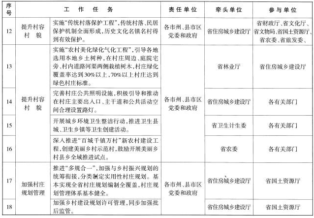 (五)著力提升村容村貌。實(shí)施“農(nóng)村公共空間整治工程”,整治集鎮(zhèn)亂搭亂建、占道經(jīng)營(yíng)等現(xiàn)象,整治村莊公共空間和庭院環(huán)境,及時(shí)清理私搭亂建、亂堆亂放,開(kāi)展“空心房”整治,拆除殘?jiān)珨啾?,?fù)耕復(fù)綠,堅(jiān)持“一戶一宅”“建新拆舊”。鼓勵(lì)創(chuàng)新,依托互聯(lián)網(wǎng)和專業(yè)化公司,探索農(nóng)戶閑置房屋多元化利用。加快推進(jìn)通村組道路建設(shè),完成3.3萬(wàn)個(gè)25戶以及100人以上的自然村通水泥(瀝青)路建設(shè)任務(wù)。充分利用本地資源,因地制宜選擇路面材料,加快推進(jìn)入戶道路建設(shè)。實(shí)施“湖湘農(nóng)民新居工程”,提升農(nóng)村建筑風(fēng)貌,推動(dòng)建設(shè)具有地域特點(diǎn)、民族特色和時(shí)代特征的農(nóng)村建筑。實(shí)施“傳統(tǒng)村落保護(hù)工程”,傳統(tǒng)村落、民居保護(hù)機(jī)制全面形成,歷史文化名鎮(zhèn)名村得到有效保護(hù)。實(shí)施“農(nóng)村美化綠化氣化工程”,引導(dǎo)各地選用本地鄉(xiāng)土樹(shù)種,在村莊周邊、庭院宅旁、村內(nèi)道路河渠兩側(cè)栽植樹(shù)木,村莊綠化覆蓋率達(dá)到30%以上,70%以上村莊達(dá)到綠色村莊標(biāo)準(zhǔn)。對(duì)村莊古樹(shù)名木掛牌建檔,挖掘和發(fā)揮古樹(shù)名木的歷史文化和景觀價(jià)值。積極引導(dǎo)和推動(dòng)在村莊主要出入口、主干道和公共活動(dòng)空間合理設(shè)置路燈。開(kāi)展城鄉(xiāng)環(huán)境衛(wèi)生整潔行動(dòng),推進(jìn)衛(wèi)生縣城、衛(wèi)生鄉(xiāng)鎮(zhèn)等衛(wèi)生創(chuàng)建活動(dòng)。深入推進(jìn)“百城千鎮(zhèn)萬(wàn)村”新農(nóng)村建設(shè)工程,重點(diǎn)開(kāi)展美麗鄉(xiāng)村示范村創(chuàng)建和縣鄉(xiāng)全域推進(jìn)試點(diǎn)工作。持續(xù)推進(jìn)農(nóng)村環(huán)境綜合整治全省域覆蓋工作。2018年,完成1.8萬(wàn)個(gè)自然村道路建設(shè),完成3000個(gè)村的農(nóng)村環(huán)境綜合整治任務(wù)。2019年,完成1.5萬(wàn)個(gè)自然村道路建設(shè),完成2000個(gè)村的農(nóng)村環(huán)境綜合整治任務(wù)。2020年,全面完成農(nóng)村環(huán)境綜合整治全省域覆蓋工作任務(wù)。