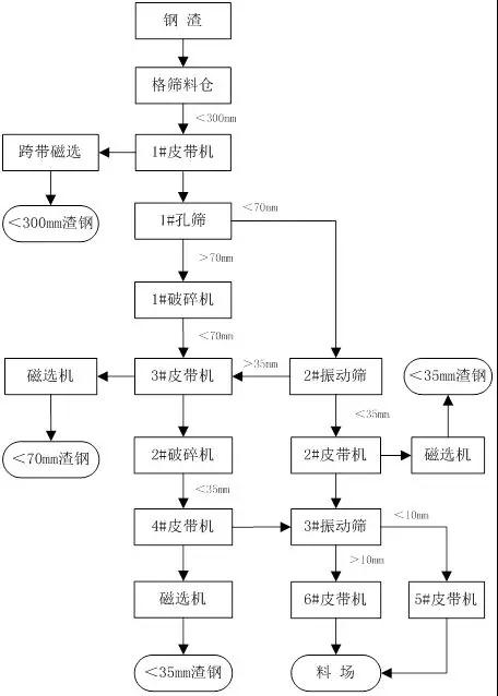 鋼渣的破碎、磁選篩分工藝流程是回收渣鋼的最基本流程,所用的破碎機(jī)包括顎式破碎機(jī)、圓錐破碎機(jī)、反擊式破碎機(jī)和雙輥破碎機(jī)等,磁選機(jī)包括跨帶式磁選機(jī)和電磁鐵式磁選機(jī),篩分設(shè)備包括格柵、單層及雙層振動(dòng)篩等。