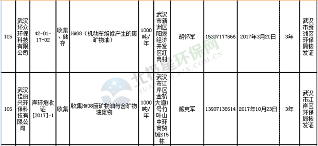 日前湖北省環(huán)保廳發(fā)布了《湖北省危險(xiǎn)廢物經(jīng)營許可證》單位名錄(截至2018年10月12日,共108家),且附有聯(lián)系電話,具體內(nèi)容如下: