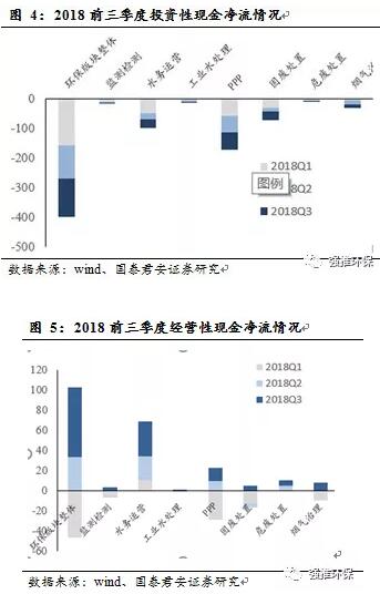 經(jīng)營(yíng)現(xiàn)金流凈額方面:2018前三季度,環(huán)保行業(yè)整體凈額為55.9億元,受益于水務(wù)運(yùn)營(yíng)與危廢處置板塊,現(xiàn)金流超前于收入確認(rèn)的行業(yè)屬性,其他板塊,現(xiàn)金流與收入的匹配性仍有待提高。