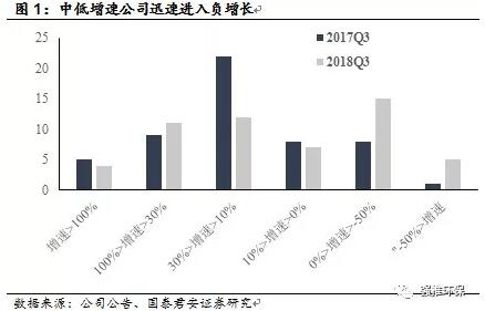 將板塊內(nèi)55個(gè)標(biāo)的2017Q3與2018Q3扣非凈利潤(rùn)增速,列示如圖2與圖3。其中,中低增速區(qū)間的公司(增速10%~30%)顯著減少,進(jìn)入負(fù)增長(zhǎng)的企業(yè)顯著增多。不同企業(yè)之間的分化愈演愈烈。