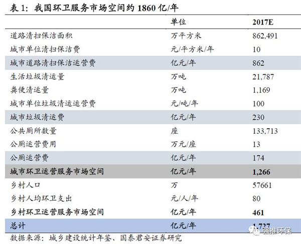 環(huán)衛(wèi)服務(wù)市場(chǎng)空間測(cè)算:保守估計(jì)每年城市1400億+鄉(xiāng)村460億。1)城市:假設(shè)城市單位清掃保潔費(fèi)、城市單位垃圾清運(yùn)運(yùn)營(yíng)費(fèi)、公廁運(yùn)營(yíng)費(fèi)用分別為10元/平方米/年、100元/噸/年、13萬元/座/年,2017及2018年城市道路清掃保潔面積、生活垃圾清運(yùn)量、糞便清運(yùn)量、公共廁所數(shù)量增速分別為8.5%、7.0%、-10.0%、3.0%,可計(jì)算出2018年城市環(huán)衛(wèi)運(yùn)營(yíng)服務(wù)市場(chǎng)空間為1358億。2)鄉(xiāng)村:假設(shè)鄉(xiāng)村人均環(huán)衛(wèi)支出為80元/人/年,根據(jù)2017年我國(guó)鄉(xiāng)村常住人口57661萬人,測(cè)算出鄉(xiāng)村環(huán)衛(wèi)運(yùn)營(yíng)服務(wù)市場(chǎng)空間461億。