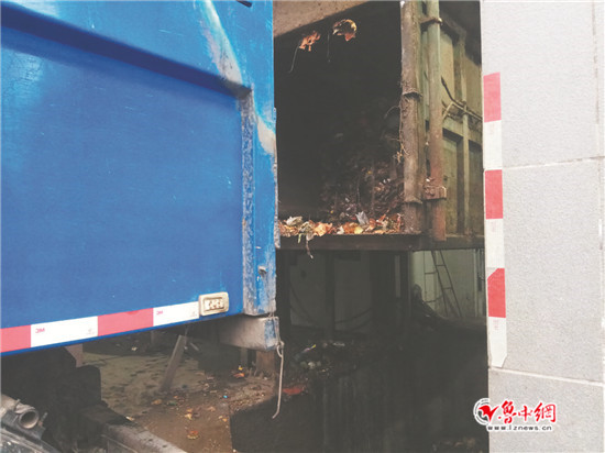 在垃圾轉(zhuǎn)運站,壓縮后的垃圾進入轉(zhuǎn)運車中。