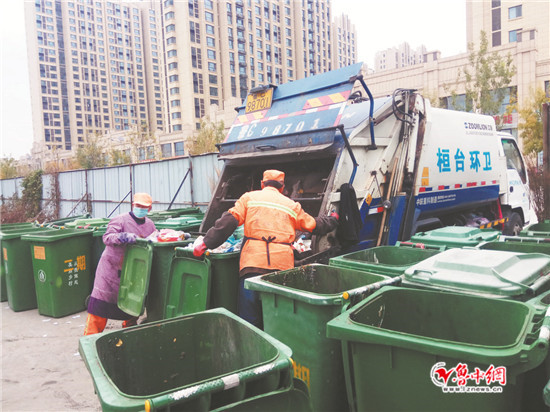 5日早晨7點10分,桓臺東岳國際9號樓1單元的居民王女士把一袋垃圾提到樓下,扔進了樓前的垃圾桶。第一個處理這袋垃圾的人,是東岳國際物業(yè)的保潔馬師傅。每天早上7點30分上班后,馬師傅和同事開著一輛專用的四輪電動車,把垃圾桶從居民樓前運到小區(qū)外面的臨時垃圾存放點。東岳國際小區(qū)有23棟樓,每個單元前面都擺著兩三個垃圾桶。馬師傅他們上午要拉四趟,下午拉一趟就可以了,“住在這個小區(qū)里的年輕人多,白天都上班了,產(chǎn)生的垃圾也少?!瘪R師傅告訴記者。