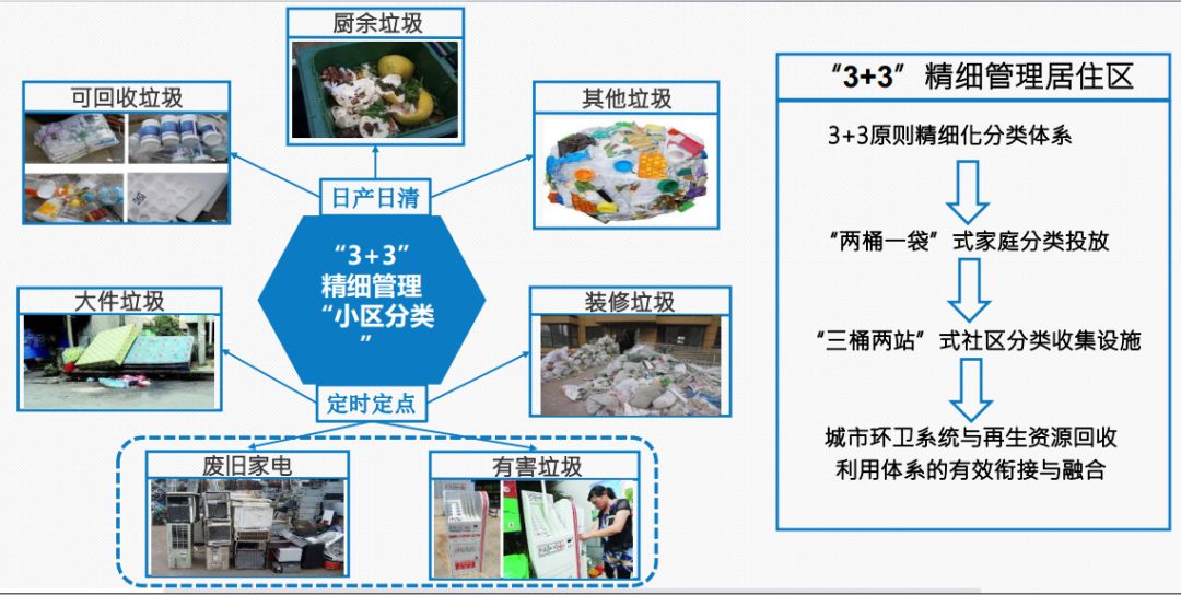 “3+3”模式實(shí)際上在社區(qū)里面分成五類垃圾——濕垃圾也就是廚余垃圾、可回收垃圾、其他垃圾、家具和大件垃圾、裝修垃圾,后來又分出了有害垃圾,但是有害垃圾界定困難而且較難收集,綜合來看實(shí)用性不大,比如手機(jī)丟棄后電池屬于有害垃圾,但是手機(jī)并不是有害的;燈管本來是用品不存在危害,燈管損壞以后汞是有害的,有人把燈管破碎以后進(jìn)行單獨(dú)收集,其實(shí)就是對(duì)汞的集中收集,由于汞是揮發(fā)的,在收集運(yùn)輸過程中更容易揮發(fā),但國(guó)內(nèi)如江蘇省、山東省明確提出要把有害垃圾列為垃圾的單獨(dú)一類。實(shí)際上居民家中理論上用品都是無害的,只有其出現(xiàn)破碎、損壞、丟棄的時(shí)候部分成分進(jìn)入到環(huán)境里才是有害的。
