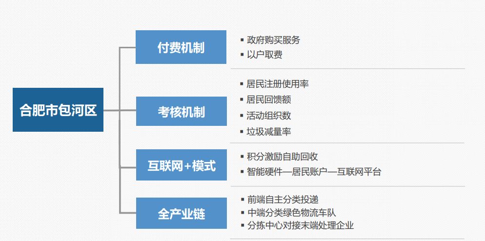 目前北京的16個(gè)區(qū)中我們已經(jīng)在8個(gè)區(qū)中開展了工作,除此之外,2017年1月,中標(biāo)合肥市包河區(qū)生活垃圾分類項(xiàng)目,該項(xiàng)目主要服務(wù)包河區(qū)10萬戶的居民垃圾分類服務(wù)工作。付費(fèi)機(jī)制是政府購(gòu)買服務(wù),按戶進(jìn)行收費(fèi),每戶280塊錢。還有一套考核機(jī)制,根據(jù)居民注冊(cè)使用率、居民回饋額、活動(dòng)組織數(shù)、垃圾減量率進(jìn)行考核與反饋。