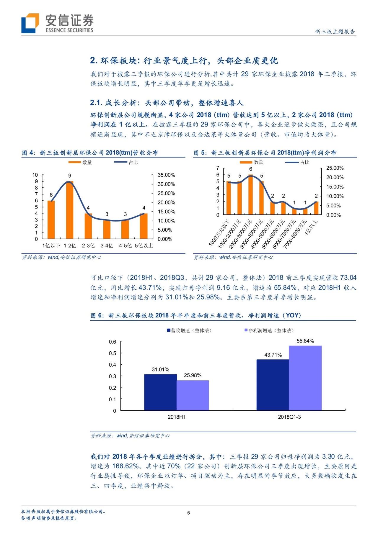 成長分析:可比口徑下,2018前三季度實現(xiàn)營收73.04億元(+43.71%);實現(xiàn)歸母凈利潤9.16億元(+55.84%),增速高于半年報。主要原因是環(huán)保創(chuàng)新層公司第三季度單季增長明顯(凈利潤增長168.62%)。且環(huán)保創(chuàng)新層公司多為各細(xì)分行業(yè)的龍頭,近70%環(huán)保公司實現(xiàn)增長,4家2018(ttm)凈利潤在5億元以上,規(guī)模逐漸顯現(xiàn),其中不乏京津環(huán)保以及金達(dá)萊等大體量公司。
