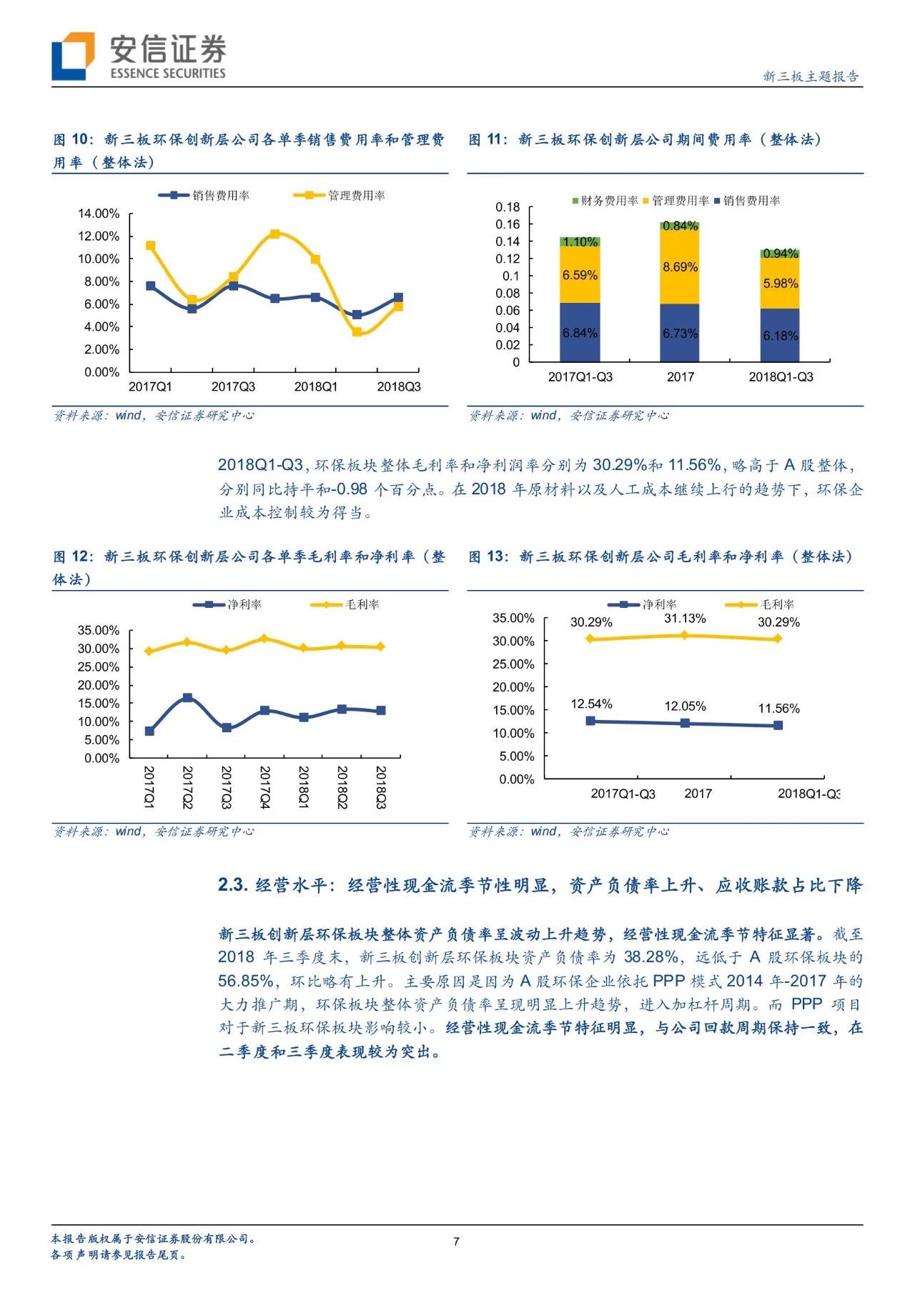 盈利能力:1)期間費(fèi)用:新三板環(huán)保板塊2018年前三季度銷售、管理、財務(wù)費(fèi)用率分別為6.18%、5.98%、0.94%,同比-0.66、-0.61、-0.16個百分點,銷售、管理費(fèi)用率控制得當(dāng)。財務(wù)費(fèi)用率低于A股環(huán)保公司(A股為2%-3%),主要原因是因為A股以PPP為主要模式,2018年以來利率信用收緊、利率繼續(xù)上行。2)2018Q1-Q3,新三板環(huán)保板塊整體毛利率和凈利率為30.29%、11.56%,略高于A股整體,分別同比持平和-0.98個百分點。