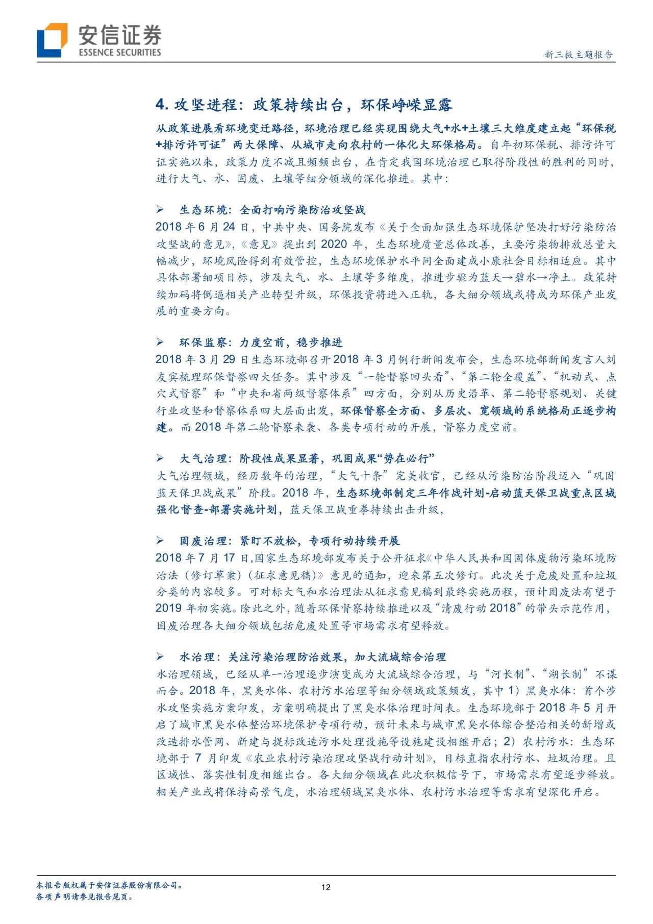 從政策進(jìn)展看環(huán)境變遷路徑,環(huán)境治理已經(jīng)實現(xiàn)圍繞大氣+水+土壤三大維度建立起“環(huán)保稅+排污許可證”兩大保障、從城市走向農(nóng)村的一體化大環(huán)保格局。自年初環(huán)保稅、排污許可證實施以來,政策力度不減且頻頻出臺,在肯定我國環(huán)境治理已取得階段性的勝利的同時,進(jìn)行大氣、水、固廢、土壤等細(xì)分領(lǐng)域的深化推進(jìn)。我們對于2018年以來各細(xì)分板塊政策及變遷進(jìn)行了梳理。而新三板擁有400家公司,覆蓋了大氣治理、水治理、固廢治理等各個領(lǐng)域。我們繼續(xù)看好環(huán)保板塊,建議從政策推進(jìn)進(jìn)程中發(fā)掘潛在機(jī)會,建議關(guān)注水治理、固廢治理和再生資源板塊投資機(jī)會。