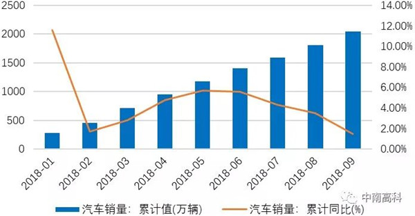 圖2:2018年汽車月累計(jì)銷量及累計(jì)同比增速