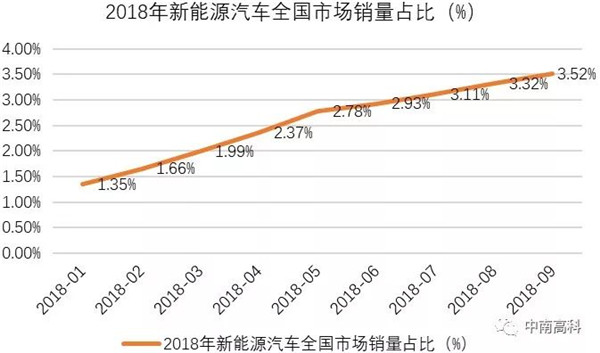 2018年1~9月(10月統(tǒng)計(jì)數(shù)據(jù)還未出),全國(guó)汽車?yán)塾?jì)銷量2049.06萬(wàn)輛,累計(jì)同比增長(zhǎng)1.49%;新能源汽車?yán)塾?jì)銷量72.1萬(wàn)輛,同比增長(zhǎng)81.1%。今年以來(lái),全國(guó)汽車銷量同比增速除了1月份為11.59%,其余月份增速均在10%以下,且大部分月份同比增速低于5%;而新能源汽車月累計(jì)同比增速均在100%上下,遠(yuǎn)高于全國(guó)汽車?yán)塾?jì)同比增速,新能源汽車在全國(guó)市場(chǎng)的占比由年初的1.35%上升至9月份的3.52%,在市場(chǎng)的占比正在快速上升。新能源汽車越來(lái)越成為決定未來(lái)國(guó)內(nèi)整車生產(chǎn)企業(yè)競(jìng)爭(zhēng)優(yōu)勢(shì)的關(guān)鍵著力點(diǎn),也正在面臨越來(lái)越多的新參與者加入。