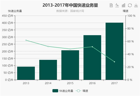 網(wǎng)購的發(fā)達(dá)促進(jìn)了快遞市場的發(fā)展。據(jù)國家郵政局統(tǒng)計,2013-2017年中國快遞業(yè)務(wù)量正在以驚人的速度上升。91.9億到400億,短短五年間這個數(shù)字竟然翻了四點(diǎn)三倍。
