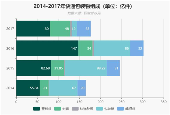 快遞業(yè)務(wù)的繁榮在促進(jìn)經(jīng)濟(jì)飛速發(fā)展的同時也產(chǎn)生了巨大的環(huán)保負(fù)擔(dān)。其中最突出的問題就是快遞包裝所帶來的資源浪費(fèi)以及環(huán)境污染。一件普通的快遞,根據(jù)商品種類的不同,一般會有塑料袋、封套、快遞膠帶、包裝箱以及編織袋五大類包裝。根據(jù)國家郵政局統(tǒng)計,2016年我國快遞包裝塑料袋使用量達(dá)147億,包裝箱達(dá)88億,快遞膠帶3.3億卷。在節(jié)能減排的號召下2017年狀況有所改觀,但形式依舊嚴(yán)峻。