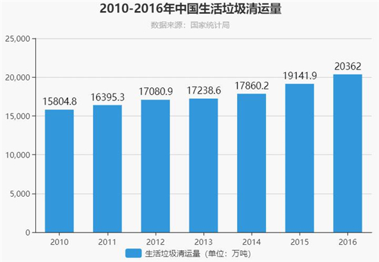 2010年到2016年的七年間,全國年垃圾清運(yùn)總量從15804.8萬噸增長到20362萬噸,其中快遞貢獻(xiàn)了不少垃圾。