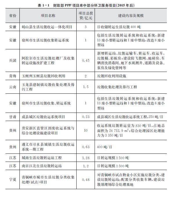 2015年開始,PPP模式在各地公用市政行業(yè)全面展開,業(yè)內(nèi)人士稱之為PPP元年。伴隨整個市場大環(huán)境,環(huán)衛(wèi)服務(wù)行業(yè)的市場化也已經(jīng)大幕開啟,越來越多的環(huán)衛(wèi)領(lǐng)域的項目開始公開招標(biāo)。各地開始出現(xiàn)一些分包作業(yè)或者環(huán)衛(wèi)一體化PPP項目,包含垃圾清運、道路清掃、設(shè)施維護等環(huán)衛(wèi)作業(yè)內(nèi)容,或打包招標(biāo)。較為典型的是2015年??谑协h(huán)衛(wèi)一體化建設(shè)全面引入PPP模式項目,4個區(qū)分別由北京環(huán)衛(wèi)集團、龍馬環(huán)衛(wèi)和深圳玉禾田公司中標(biāo)。2015年財政部建立的PPP項目庫中首次出現(xiàn)了17個環(huán)衛(wèi)項目,總規(guī)模約42億元,主要以垃圾清運項目為主。截至目前通過2015年財政部建立的PPP項目庫檢索生活垃圾相關(guān)的PPP項目,有多達202條項目記錄,包含生活垃圾清運、轉(zhuǎn)運、分揀、終端處理設(shè)施新建和改擴建等項目。