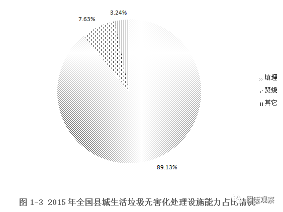 2015全國縣城生活垃圾無害化處理設(shè)施共有1187座,無害化處理量為5259.94萬噸,比2014年分別增長5.14%和10.35%。目前,衛(wèi)生填埋無論從設(shè)施數(shù)量和處理能力依舊是我國縣城垃圾無害化處理最主要方式。2015年衛(wèi)生填埋場1108座,比上一年新增53座;填埋無害化處理能力157615噸/日,年無害化處理量為4688.26萬噸,占縣城生活垃圾無害化處理總能力的89.13%,與去年89.41%基本持平。2015,全國縣城焚燒廠37座,較去年增長了3座;無害化處理總量401.43萬噸,較2014年的344.1萬噸,增長了16.66%,但占縣城生活垃圾無害化處理總能力比例只稍微提升了0.41%。其他無害化處理設(shè)施,2015年縣城共有42座,較2014年的40座,只增長了2座,總的處理量與2014年相比也只增長了9.42萬噸??h城生活垃圾的處理設(shè)施和能力未發(fā)生明顯變化。