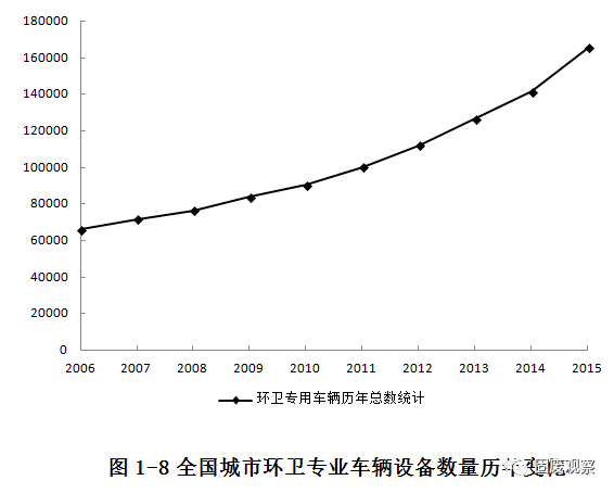 2015年全國城市環(huán)衛(wèi)專用車輛設(shè)備總數(shù)達到165725臺(輛),比2014年增加24294臺(輛),增長率達到17.18%。2006至2015年的10年期間,環(huán)衛(wèi)專用車輛總數(shù)平均年增長率達到8.51%,持續(xù)保持高速增長。