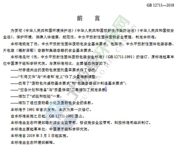 上述標(biāo)準(zhǔn)自2019年3月1日起實(shí)施,自實(shí)施之日起,《低、中水平放射性固體廢物包安全標(biāo)準(zhǔn)》(GB 12711-1991)廢止。