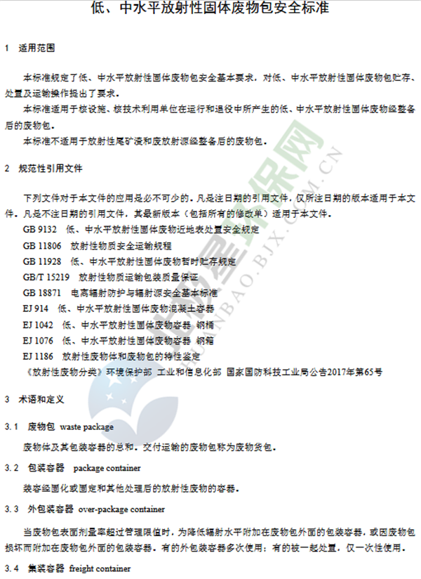 為貫徹《中華人民共和國環(huán)境保護(hù)法》《中華人民共和國放射性污染防治法》《中華人民共和國核安全法》,保護(hù)環(huán)境,保障人體健康,規(guī)范低、中水平放射性固體廢物安全管理,制定本標(biāo)準(zhǔn)。本標(biāo)準(zhǔn)規(guī)定了低、中水平放射性固體廢物包安全基本要求,包括低、中水平放射性固體包裝容器、外包裝(輻射屏蔽)容器和集裝容器的安全基本要求。