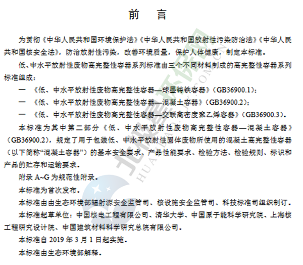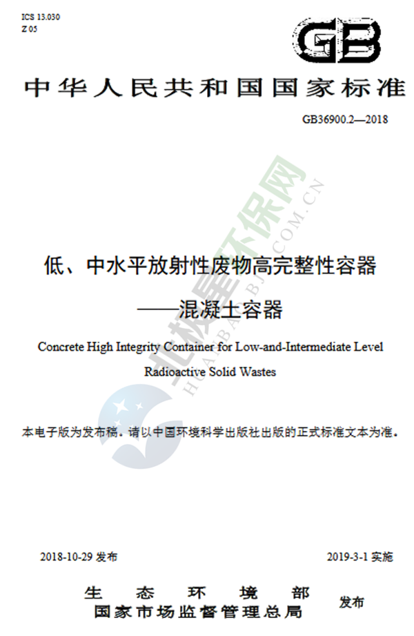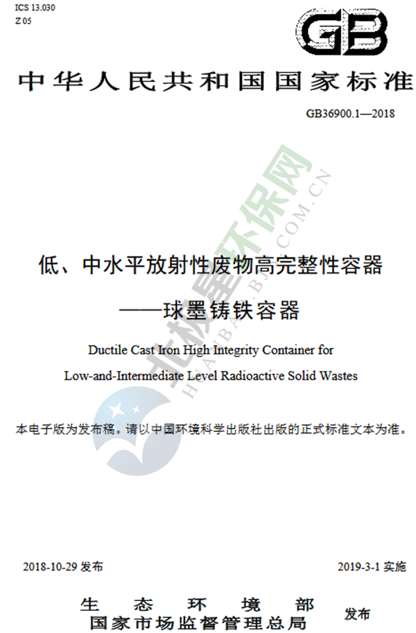 為貫徹《中華人民共和國環(huán)境保護(hù)法》《中華人民共和國放射性污染防治法》《中華人民共和國核安全法》,防治放射性廢物污染,保障人體健康,現(xiàn)批準(zhǔn)《低、中水平放射性固體廢物包安全標(biāo)準(zhǔn)》《低、中水平放射性廢物高完整性容器——球墨鑄鐵容器》《低、中水平放射性廢物高完整性容器——混凝土容器》《低、中水平放射性廢物高完整性容器——交聯(lián)高密度聚乙烯容器》等4項(xiàng)標(biāo)準(zhǔn)為國家放射性污染防治標(biāo)準(zhǔn),并由生態(tài)環(huán)境部與國家市場監(jiān)督管理總局聯(lián)合發(fā)布。